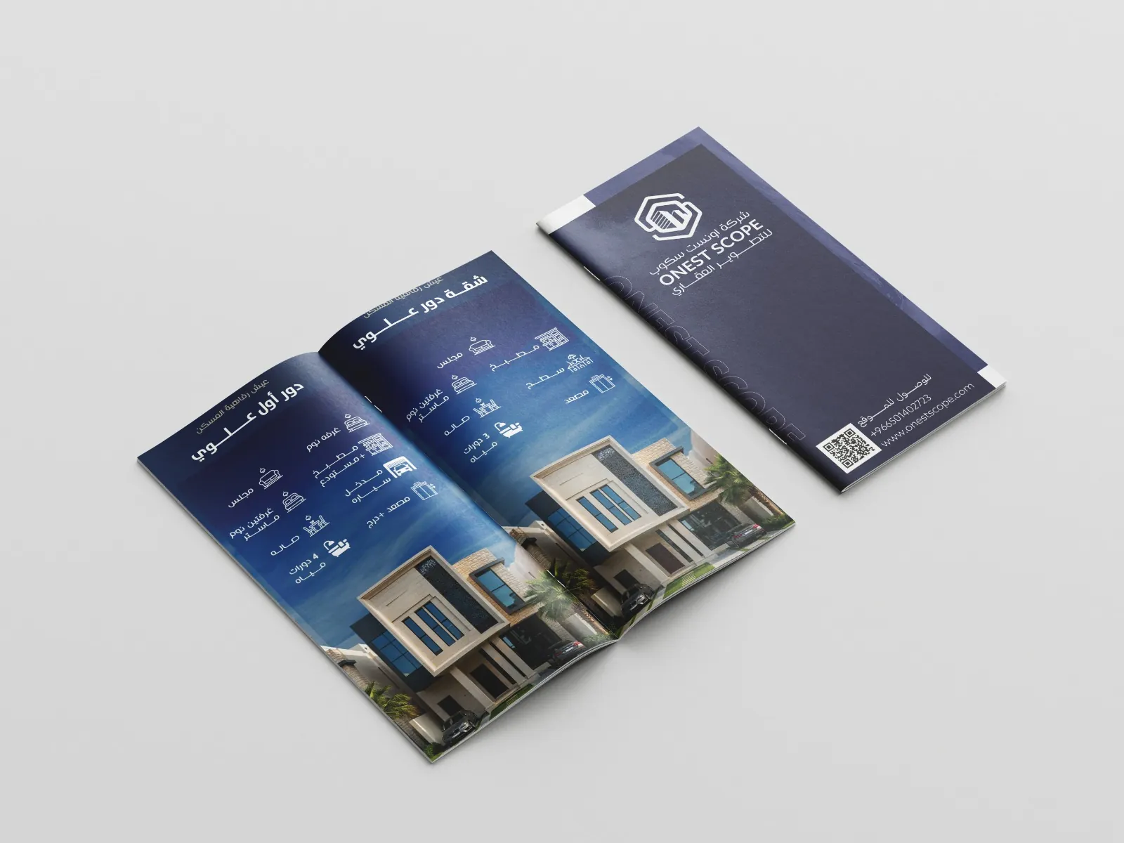 A professional marketing brochure was designed for Onset Scope Real Estate Development in Riyadh, showcasing a modern residential project with a premium and trustworthy visual identity. The design utilizes deep blue gradients to reinforce credibility and stability, while architectural visuals are prominently displayed to strengthen purchase intent. Content structure was carefully organized to highlight project features, space distribution, and competitive advantages. The result is a clean, modern real estate presentation tailored to attract serious buyers and investors.
